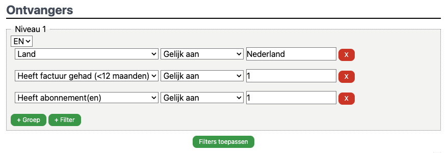 Voorbeeld: selecteer alle klanten in Nederland met een actief abonnement die in de afgelopen 12 maanden een factuur hebben ontvangen.