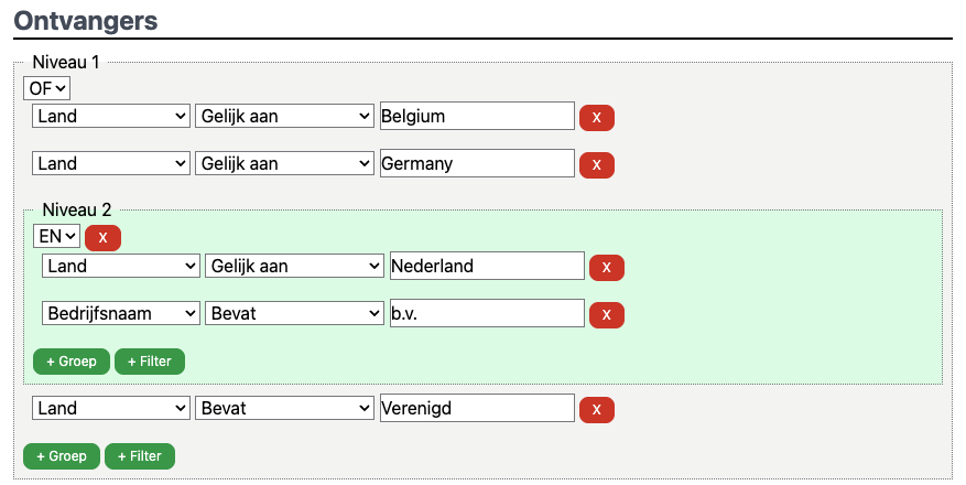 Een impressie van de filtermogelijkheden: selecteer alle klanten uit België, Duitsland, Nederland waarbij de bedrijfsnaam 'b.v.' bevat, of waar de naam van het land 'Verenigd' bevat.